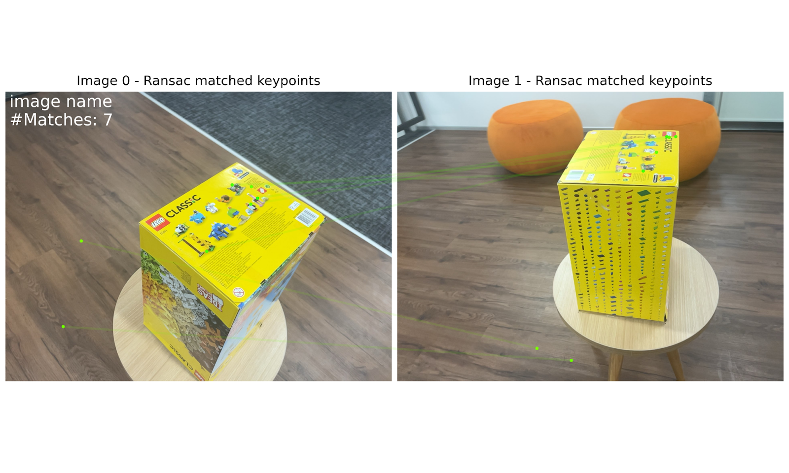 Once keypoints are identified, the next step is to match these key points between images. This involves finding keypoint correspondences that are likely to represent the same physical point in the scene. We use an ensemble of a graph neural network combined with a transformer based detector free matcher with a distance threshold of 0.7 to produce robust initial matches. We further filter the matches obtained using RANSAC for outlier removal to ensure that only correct matches are considered during subsequent stages of the SfM pipeline. Because exhaustive feature matching amongst all images is an expensive operation, we have found that matching each image to its top 20 most co-visible frames produces sufficiently robust feature matches.