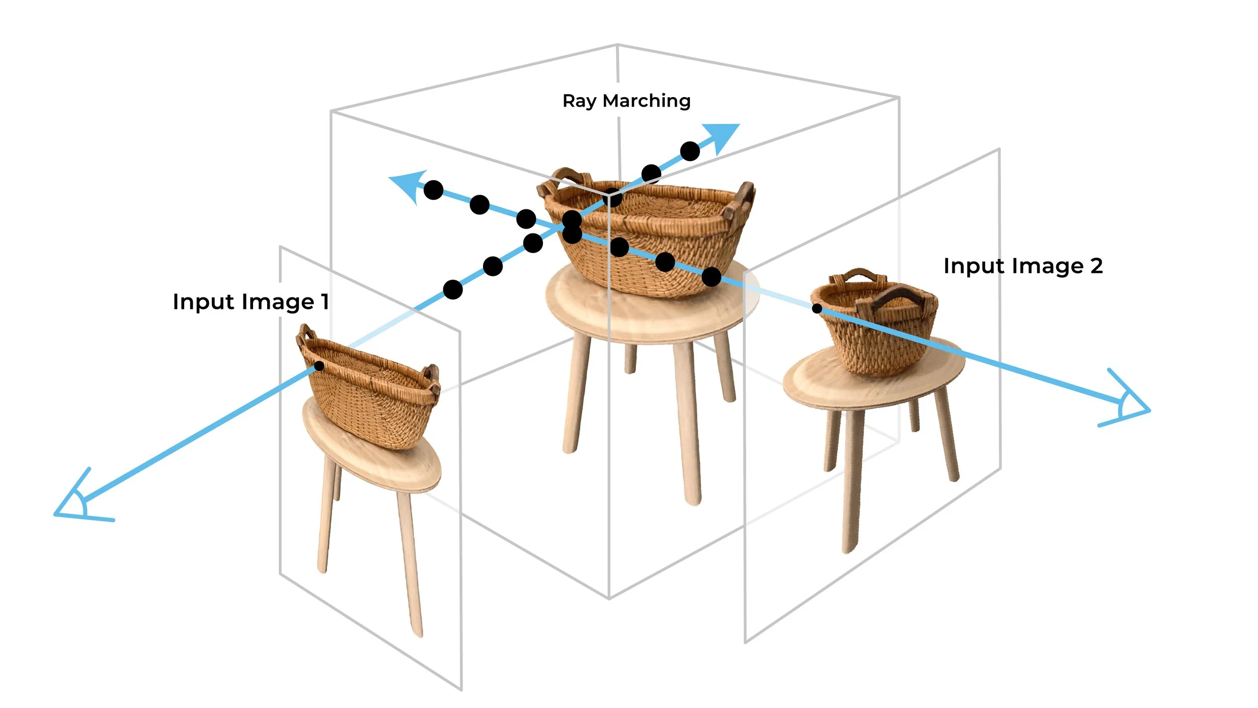 Finally, borrowing long-standing principles of volumetric rendering, the method integrates color values over the ray and gets a final pixel value for each ray.